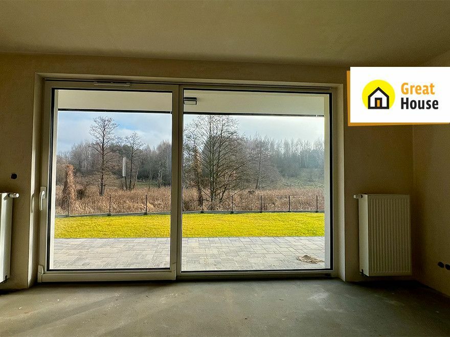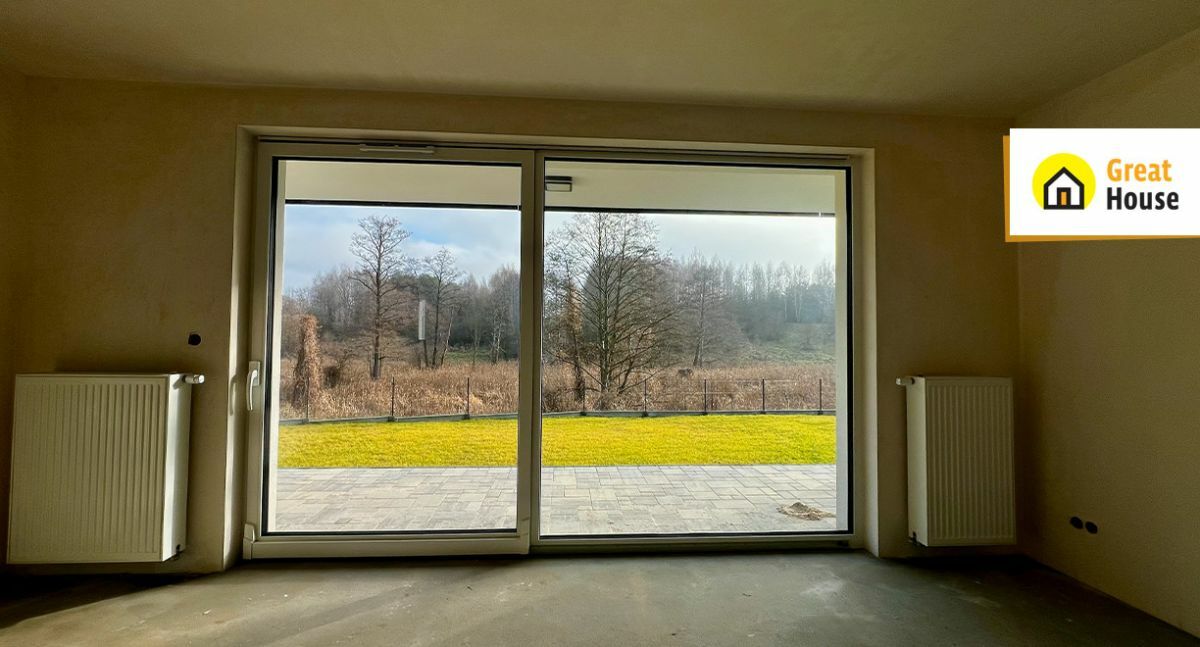 w salonie duże, przesuwne okno tarasowe z wyjściem na ogród / taras